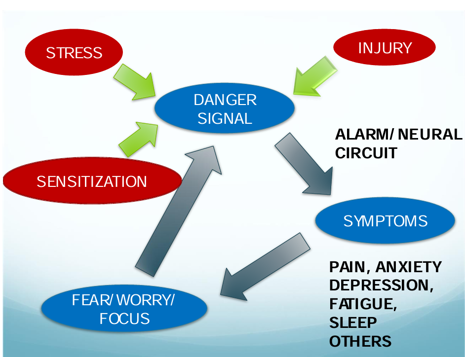 The danger signal in our brains can be activated due to a number of factors including stress, injury, illness or trauma. Although not always initiated in childhood, when early trauma and other adverse events happen this can lead to to the generalised feeling of being “unsafe” which sensitizes the danger/alarm signal and can predispose us to develop neural circuit disorders with similar or other stressful life events. The activation of this alarm/neural circuit can lead to symptoms which can cause further fear, worry and stress which contributes to the continual cycle of activation of the ‘unsafe’ danger signal which causes more pain and ongoing symptoms. The base of this work is to communicate safety to the nervous system through education and with the use of other psychotherapeutic modalities.